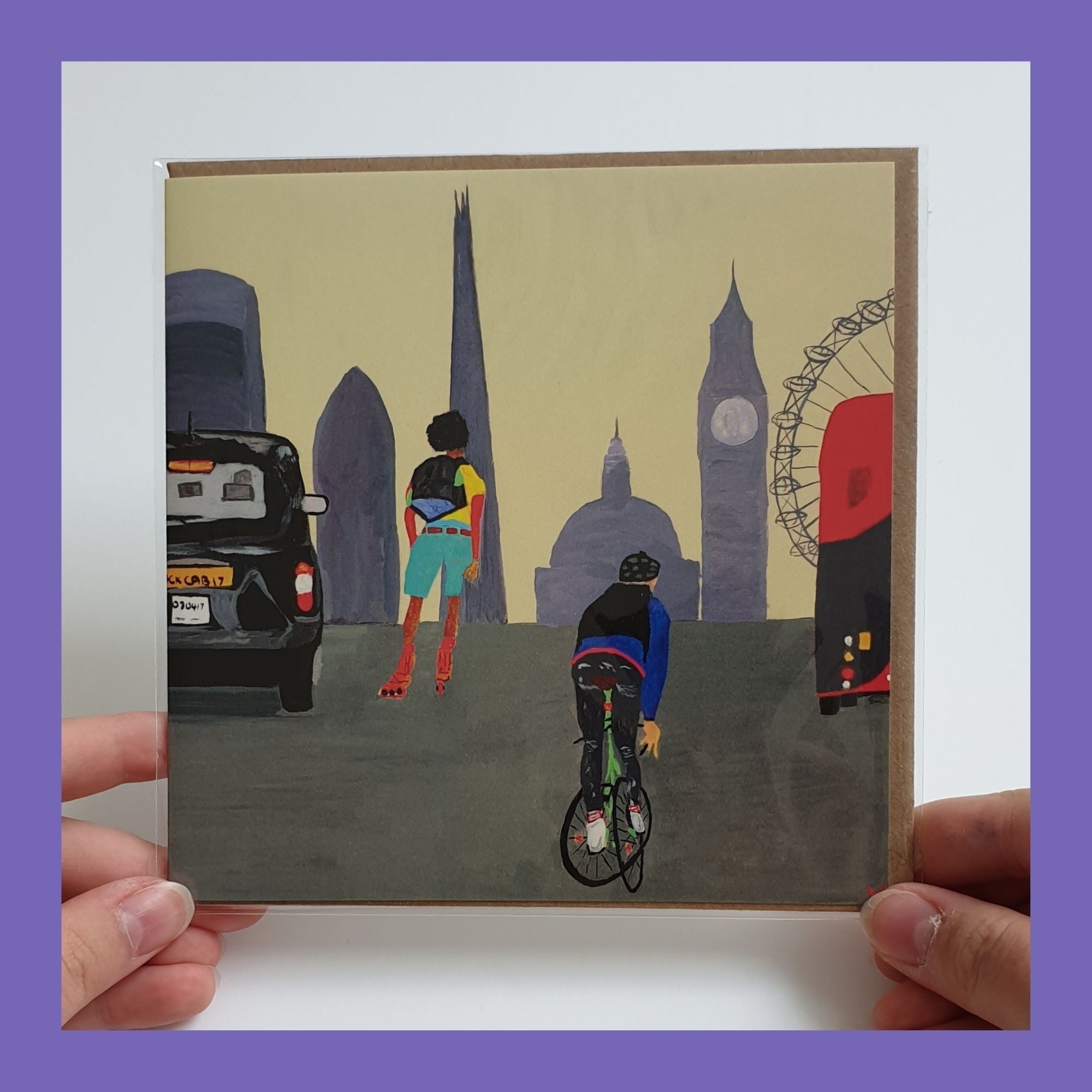 The London Calling Illustrated Greetings Card gives you the feeling of London in one card. Busy streets, iconic landmarks and that unmistakable city energy you never forget, this fine art greetings card captures the warmth and beauty of the city life.