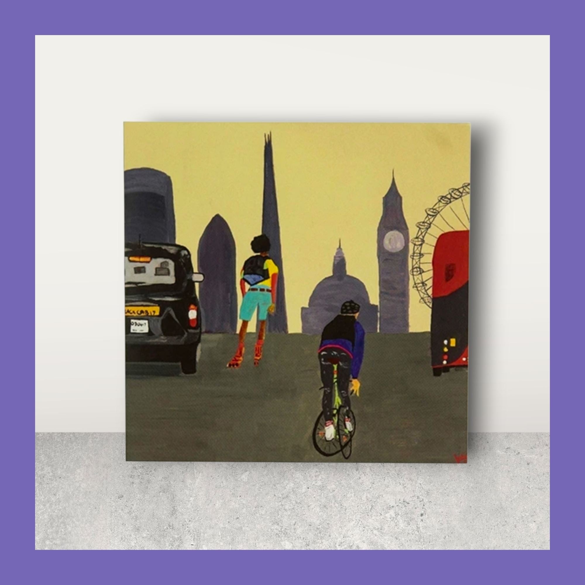 Originally painted in acrylic by UK artist Julie Westmore, The London Calling Greetings Card features a modern illustrated collage design of London life, blending iconic landmarks like St Paul’s Cathedral and Big Ben with the modern London skyline including the Gherkin and the Shard. Cyclists, black taxis, buses, and city movement bring today’s London to life in a warm, artistic way.